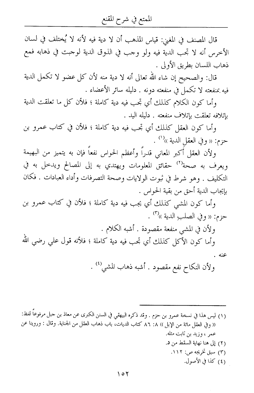 (¬1) ليس هذا في نسخة عمرو بن حزم. وقد ذكره البيهقي في السنن الكبرى عن معاذ بن جبل مرفوعاً لفظ: «وفي العقل مائة من الإبل» 8: 86 كتاب الديات، باب ذهاب العقل من الجناية. وقال: وروينا عن عمر، وزيد بن ثابت مثله.