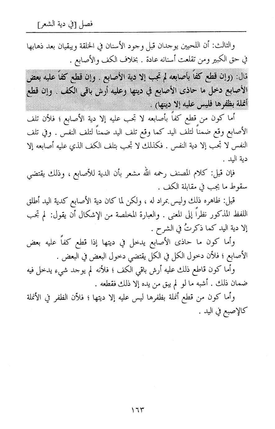 أما كون من قطع كفاً بأصابعه لا تجب عليه إلا دية الأصابع؛ فلأن تلف الأصابع وقع ضمناً لتلف اليد كما وقع تلف اليد ضمناً لتلف النفس. وفي تلف النفس لا تجب إلا دية النفس. فكذلك لا تجب بتلف الكف الذي عليه أصابعه إلا دية اليد.