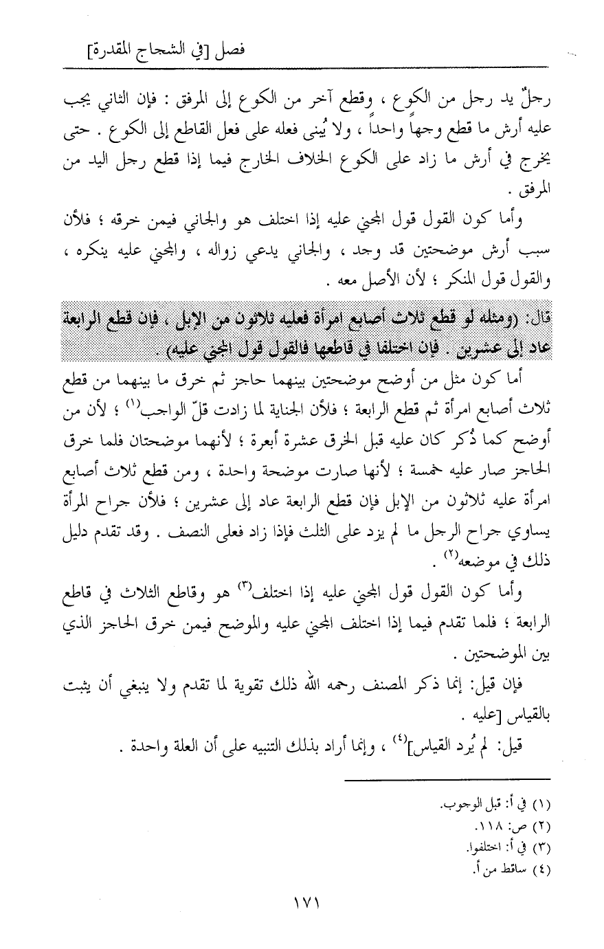 رجلٌ يد رجل من الكوع، وقطع آخر من الكوع إلى المرفق: فإن الثاني يجب عليه أرش ما قطع وجهاً واحداً، ولا يُبنى فعله على فعل القاطع إلى الكوع. حتى يخرج في أرش ما زاد على الكوع الخلاف الخارج فيما إذا قطع رجل اليد من المرفق.