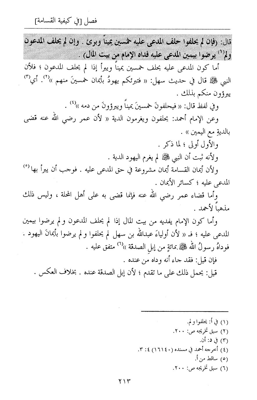 وأما كون الإمام يفديه من بيت المال إذا لم يحلف المدعون ولم يرضوا بيمين المدعى عليه؛ فـ «لأن أولياءَ عبدالله بن سهل لم يحلفوا ولم يرضوا بأيمانَ اليهود. فوداهُ رسولُ الله صلى الله عليه وسلم بمائةٍ من إبلِ الصدقة» (¬6) متفق عليه.
