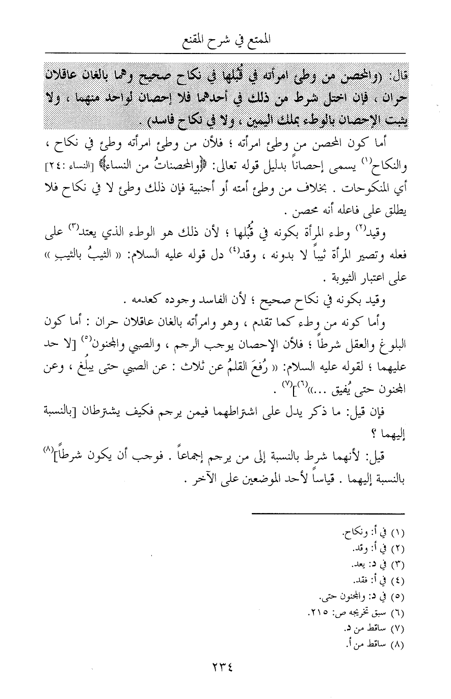 أما كون المحصن من وطئ امرأته؛ فلأن من وطئ امرأته وطئ في نكاح، والنكاح (¬1) يسمى إحصاناً بدليل قوله تعالى: {والمحصناتُ من النساء} [النساء: 24] أي المنكوحات. بخلاف من وطئ أمته أو أجنبية فإن ذلك وطئ لا في نكاح فلا يطلق على فاعله أنه محصن.