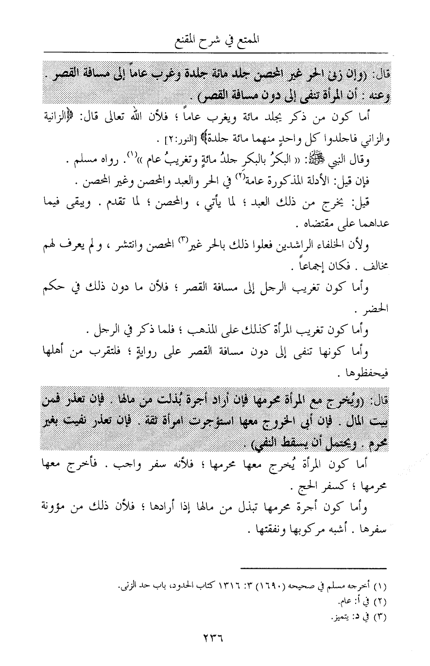 قال: (وإن زنى الحر غير المحصن جلد مائة جلدة وغرب عاماً إلى مسافة القصر. وعنه: أن المرأة تنفى إلى دون مسافة القصر).
