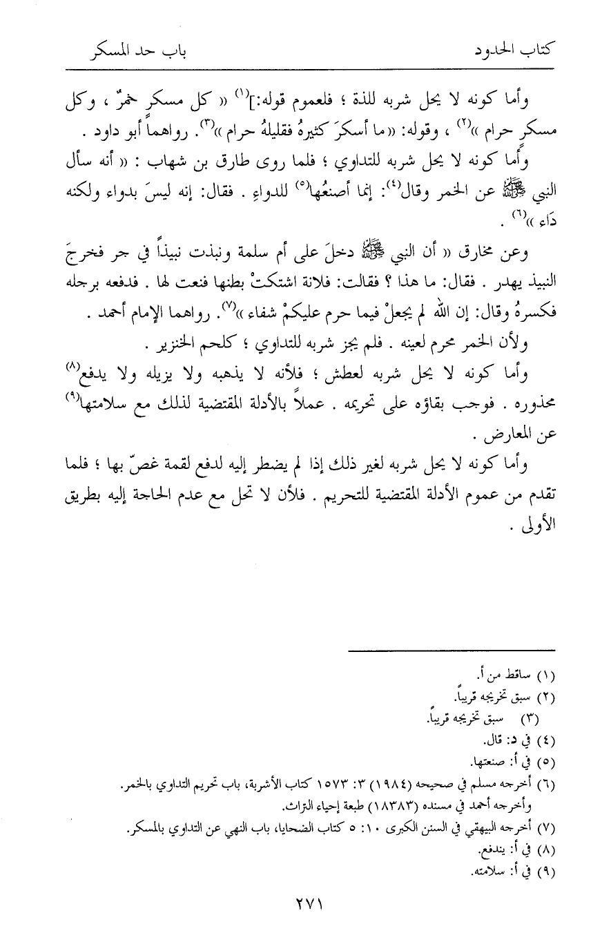 (¬7) أخرجه البيهقي في السنن الكبرى 10: 5 كتاب الضحايا، باب النهي عن التداوي بالمسكر.