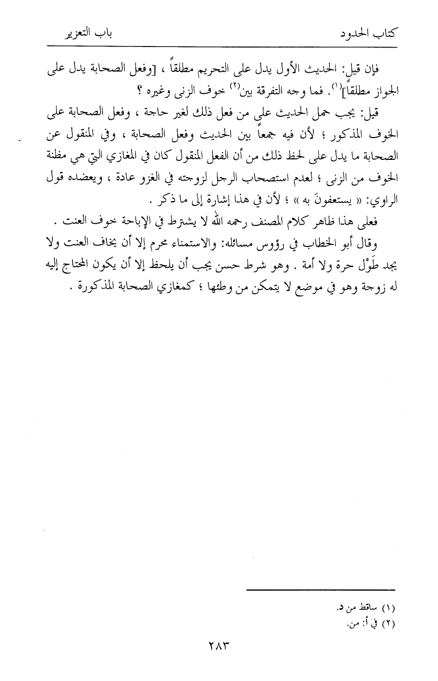 وقال أبو الخطاب في رؤوس مسائله: والاستمناء محرم إلا أن يخاف العنت ولا يجد طَوْل حرة ولا أمة. وهو شرط حسن يجب أن يلحظ إلا أن يكون المحتاج إليه له زوجة وهو في موضع لا يتمكن من وطئها؛ كمغازي الصحابة المذكورة.