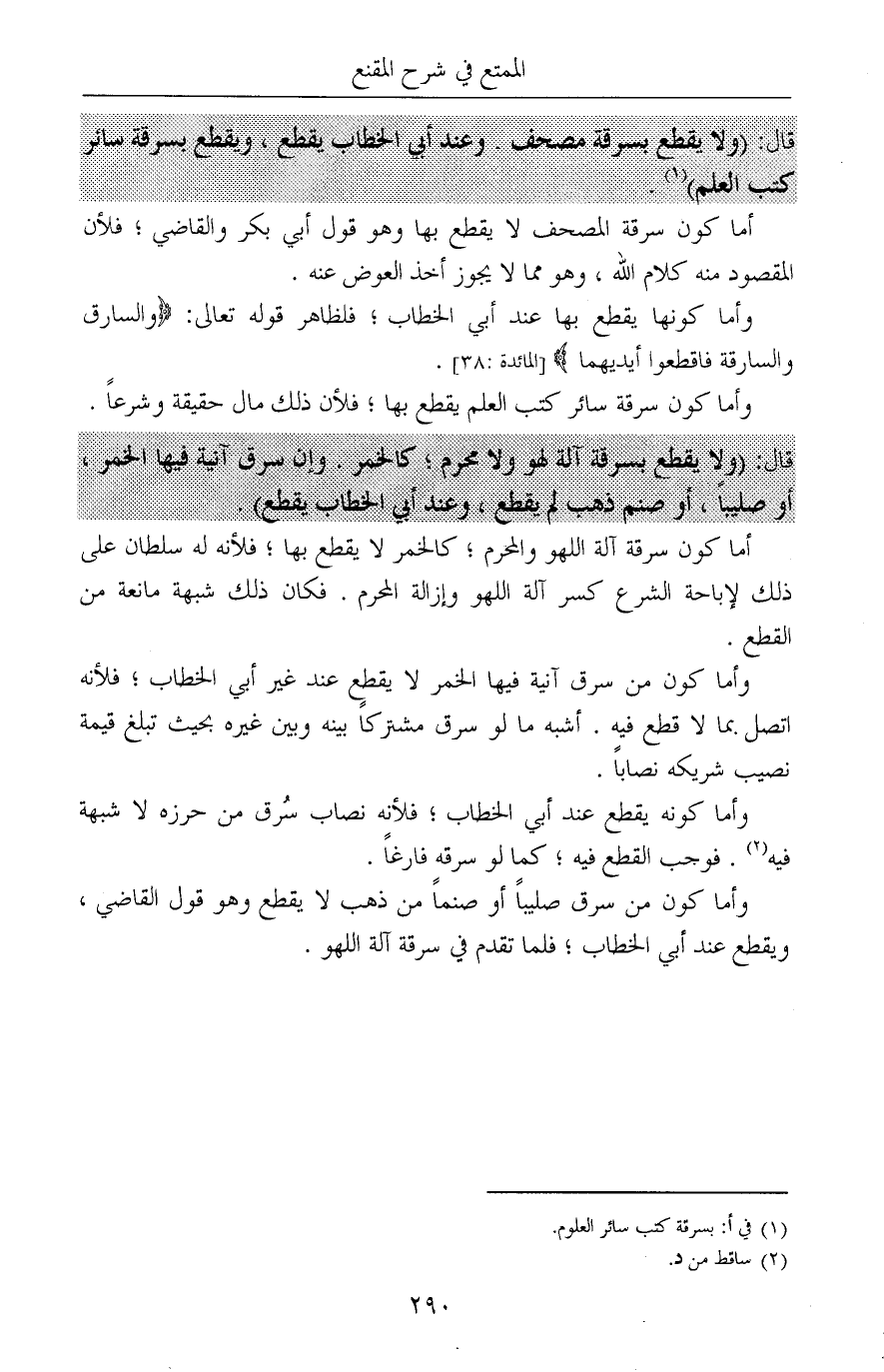 قال: (ولا يقطع بسرقة مصحف. وعند أبي الخطاب يقطع، ويقطع بسرقة سائر كتب العلم) (¬1).