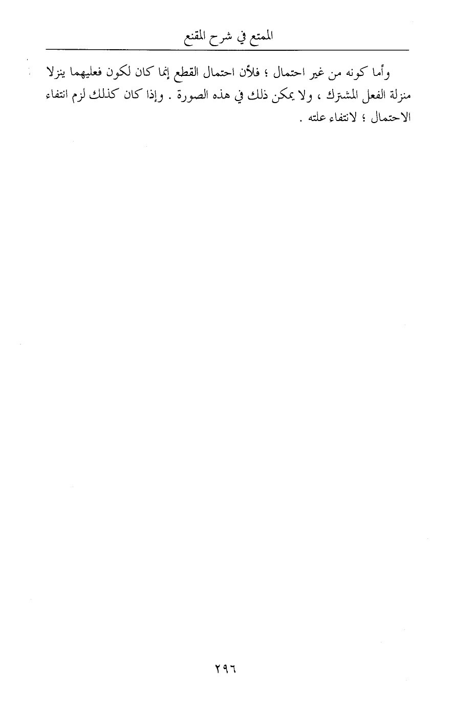 وأما كونه من غير احتمال؛ فلأن احتمال القطع إنما كان لكون فعليهما ينزلا منزلة الفعل المشترك، ولا يمكن ذلك في هذه الصورة. وإذا كان كذلك لزم انتفاء الاحتمال؛ لانتفاء علته.