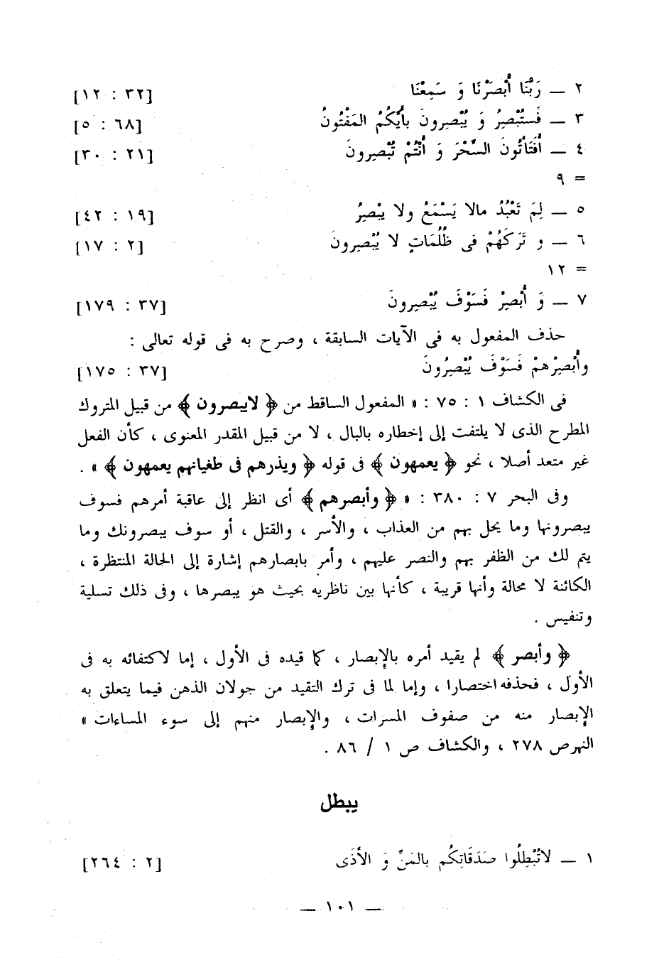 في الكشاف 1: 75: «المفعول الساقط من {لا يبصرون} من قبيل المتروك المطرح الذي لا يلتفت إلى إخطاره بالبال، لا من قبيل المقدر المعنوي، كأن الفعل غير متعد أصلاً، نحو {يعمهون} في قوله {ويذرهم في طغيانهم يعمهون}».