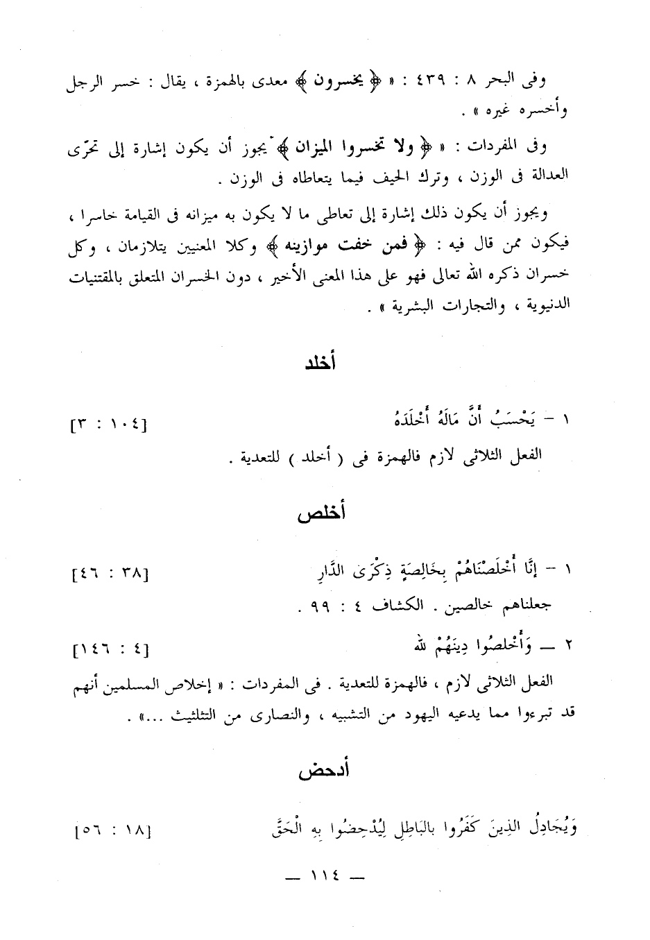 الفعل الثلاثي لازم، فالهمزة للتعدية. في المفردات: «إخلاص المسلمين أنهم قد تبرءوا مما يدعيه اليهود من التشبيه، والنصارى من التثليث ...».