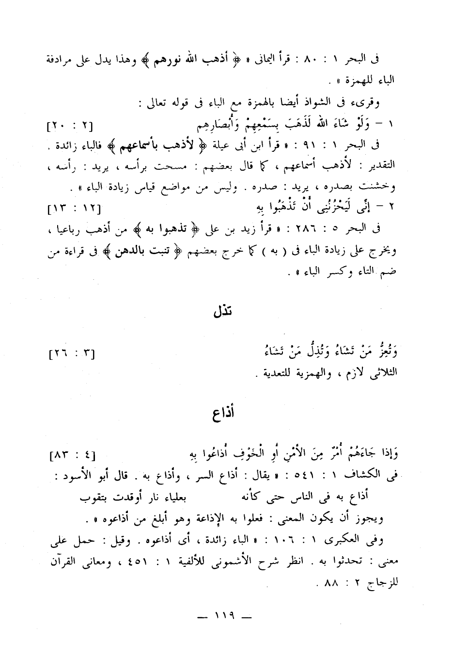 في البحر 1: 80: قرأ اليماني «{أذهب الله نورهم} وهذا يدل على مرادفة الباء للهمزة».
