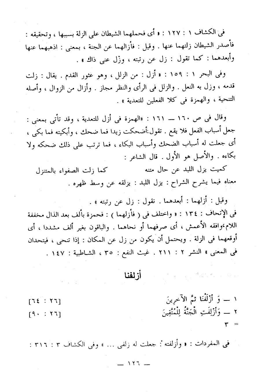 وفي البحر 1: 159: «أزل: من الزلل، وهو عثور القدم. يقال: زلت قدمه، وزل به النعل. والزلل في الرأي والنظر مجاز. وأزال من الزوال، وأصله التنحية، والهمزة في كلا الفعلين للتعدية».