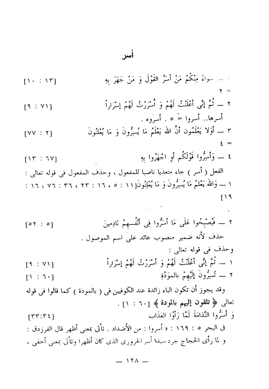 في البحر 5: 169: «أسروا: من الأضداد. تأتي بمعنى أظهر قال الفرزدق: ولما رأى الحجاج جرد سيفه أسر الحروري الذي كان أظهرا وتأتي بمعنى أخفى،