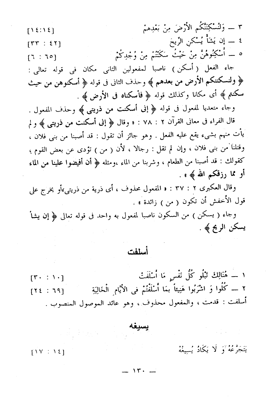 قال الفراء في معاني القرآن 2: 78: «وقال: {إني أسكنت من ذريتي} ولم يأت منهم بشيء يقع عليه الفعل. وهو جائز أن تقول: قد أصبنا من بني فلان، وقتلنا من بني فلان، وإن لم تقل: رجالا، لأن (من) تؤدي عن بعض القوم؛ كقولك: قد أصبنا من الطعام، وشربنا من الماء، ومثله {أن أفيضوا علينا من الماء أو مما رزقكم الله}».
