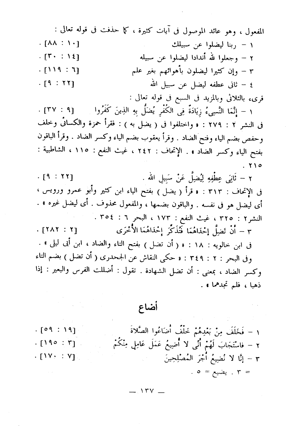 في الإتحاف: 313: «قرأ (يضل) بفتح الياء ابن كثير وأبو عمرو ورويس، أي ليضل هو في نفسه. والباقون بضمها، والمفعول محذوف. أي ليضل غيره». النشر 2: 325، غيث النفع: 173، البحر 6: 354.
