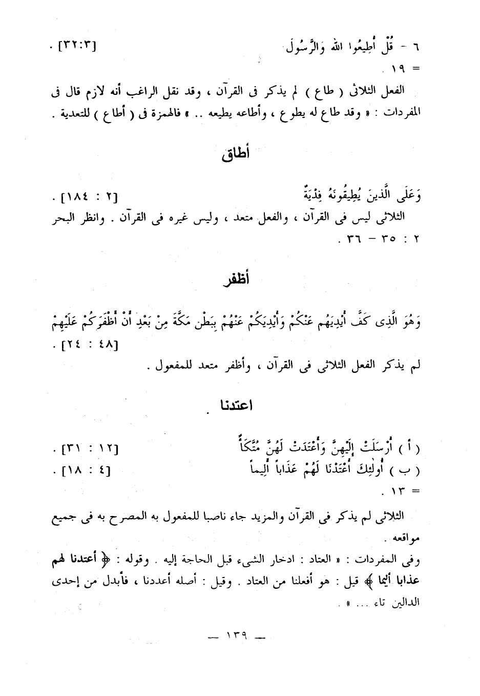 وفي المفردات: «العتاد: ادخار الشيء قبل الحاجة إليه. وقوله: {أعتدنا لهم عذابا أليما} قيل: هو أفعلنا من العتاد. وقيل: أصله أعددنا، فأبدل من إحدى الدالين تاء ...».