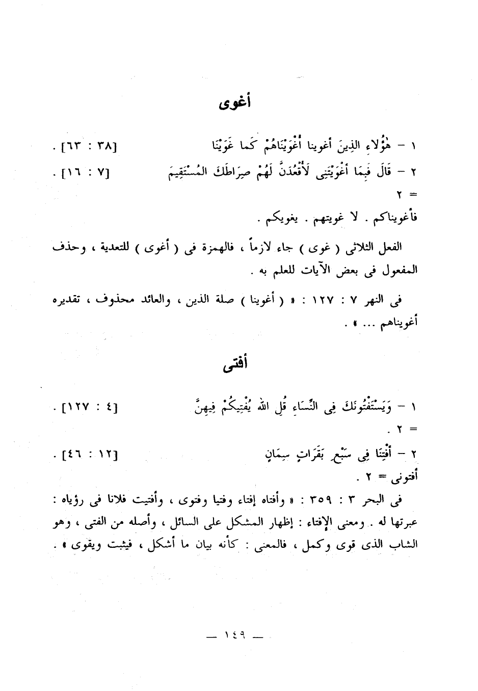 في البحر 3: 359: «وأفتاه إفتاء وفتيا وفتوى، وأفتيت فلانا في رؤياه: عبرتها له. ومعنى الإفتاء: إظهار المشكل على السائل، وأصله من الفتى، وهو الشاب الذي قوى وكمل، فالمعنى: كأنه بيان ما أشكل، فيثبت ويقوى».