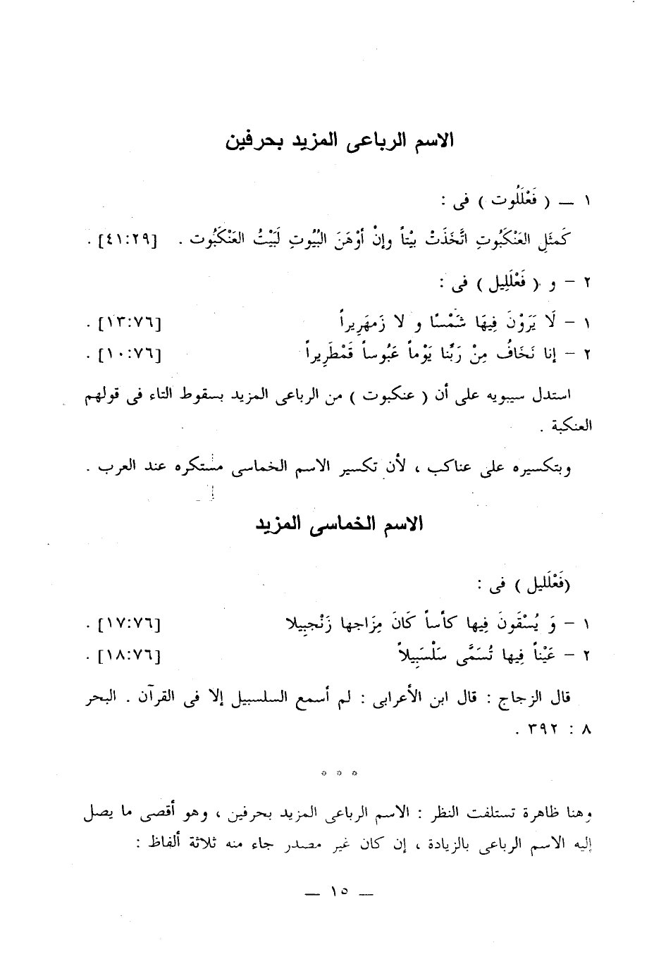 وهنا ظاهرة تستلفت النظر: الاسم الرباعي المزيد بحرفين، وهو أقصى ما يصل إليه الاسم الرباعي بالزيادة، إن كان غير مصدر جاء منه ثلاثة ألفاظ: