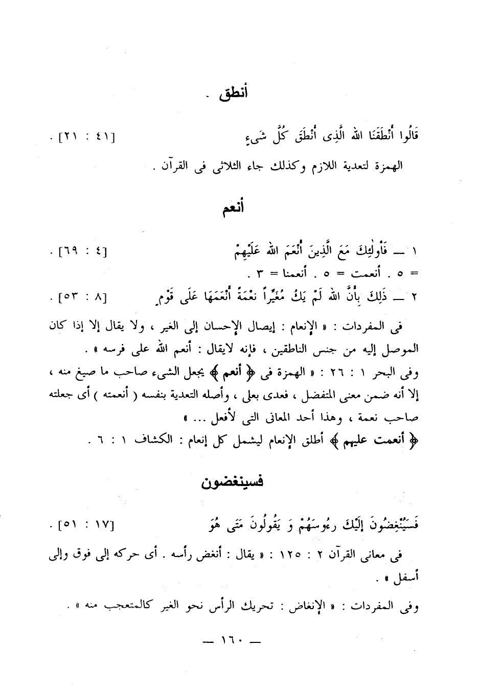 وفي البحر 1: 26: «الهمزة في {أنعم} يجعل الشيء صاحب ما صيغ منه، إلا أنه ضمن معنى المتفضل، فعدى بعلى، وأصله التعدية بنفسه (أنعمته) أي جعلته {أنعمت عليهم} أطلق الإنعام ليشمل كل إنعام: الكشاف 1: 6».