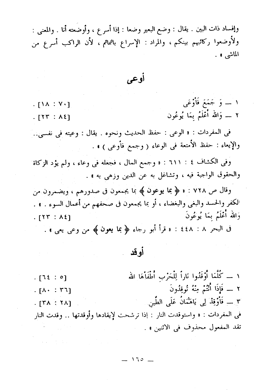 في المفردات: «الوعي: حفظ الحديث ونحوه. يقال: وعيته في نفسي ... والإيعاء: حفظ الأمتعة في الوعاء (وجمع فأوعى)».