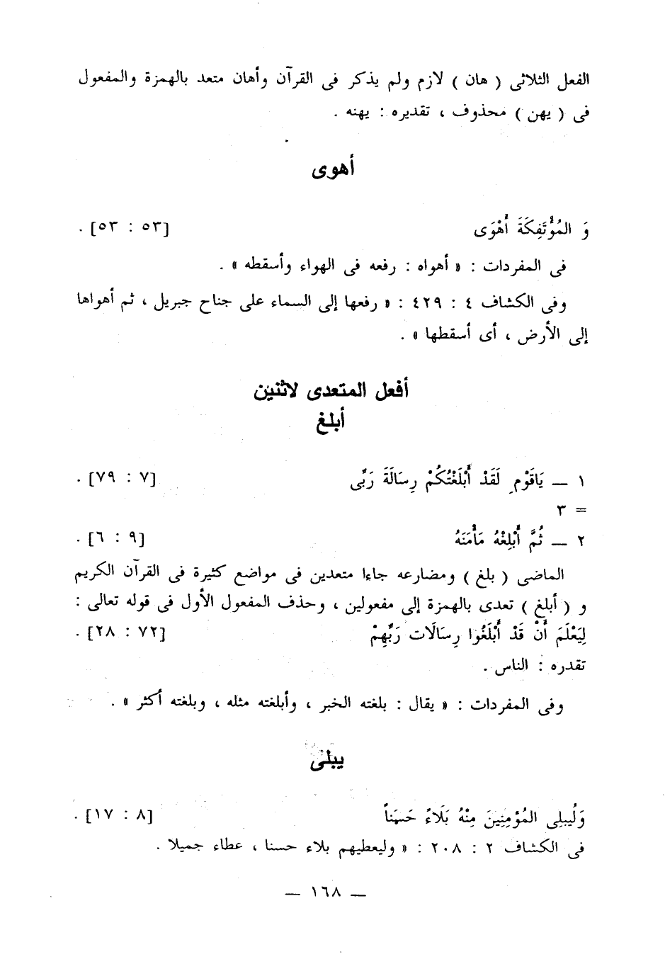 الماضي (بلغ) ومضارعه جاء متعدين في مواضع كثيرة في القرآن الكريم و (أبلغ) تعدي بالهمزة إلى مفعولين، وحذف المفعول الأول في قوله تعالى: