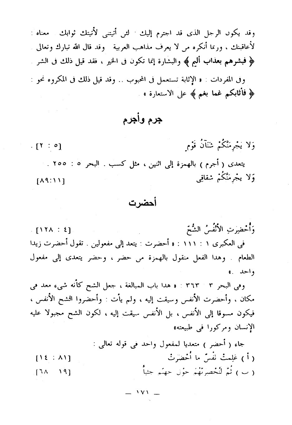 وفي البحر 3: 363: «هذا باب المبالغة، جعل الشح كأنه شيء معد في مكان، وأحضرت الأنفس وسيقت إليه، ولم يأت: وأحضروا الشح الأنفس، فيكون مسوقا إلى الأنفس، بل الأنفس سيقت إليه، لكون الشح مجبولاً عليه الإنسان ومركوزًا في طبيعته».
