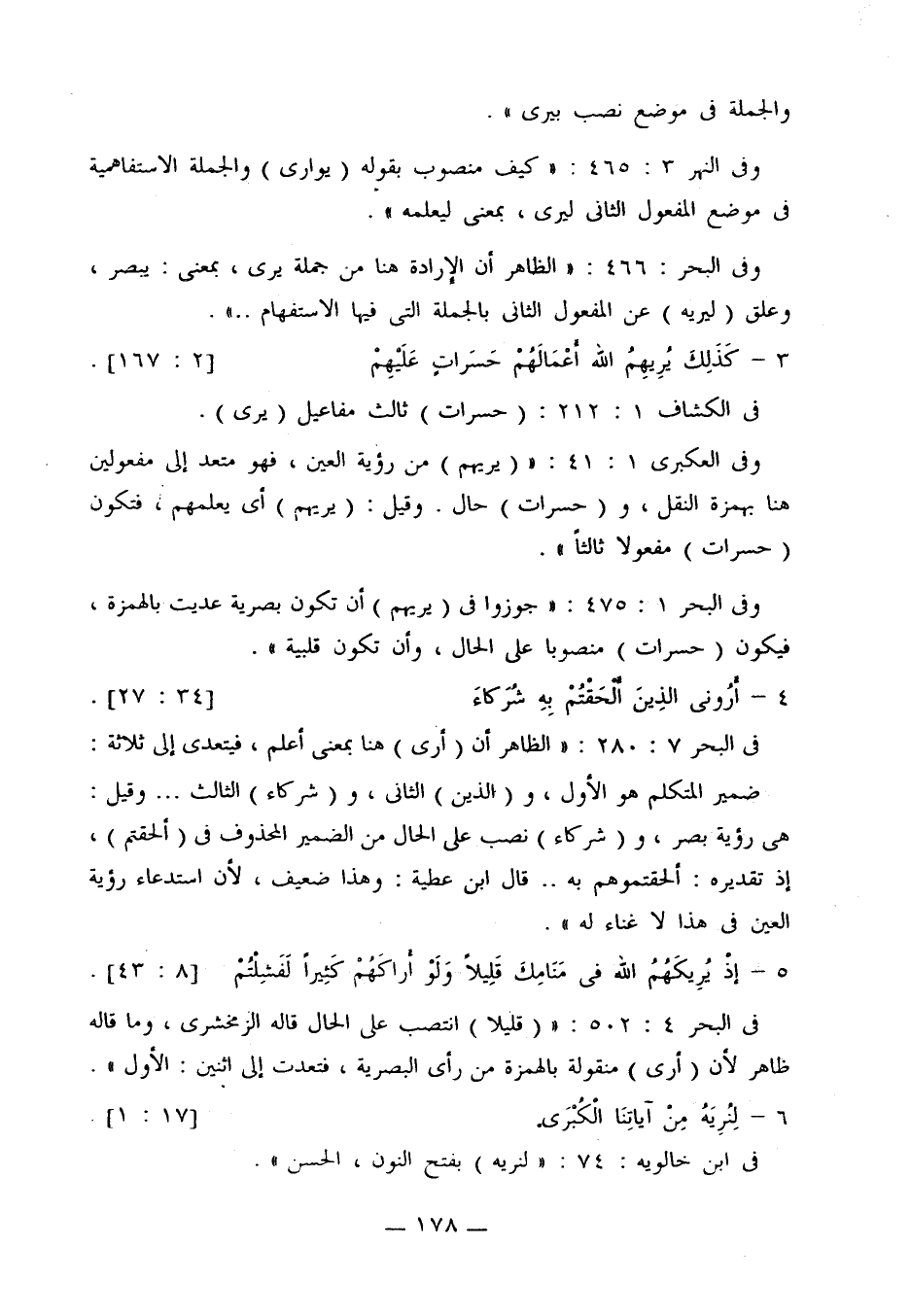 وفي البر 1: 475: «جوزوا في (يريهم) أن تكون بصرية عديت بالهمزة، فيكون (حسرات) منصوبًا على الحال، وأن تكون قلبية».