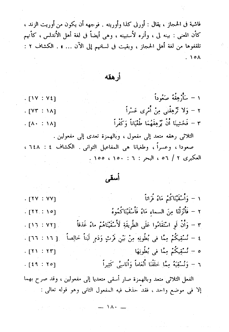الفعل الثلاثي متعد وبالهمزة صار أسقي متعديًا إلى مفعولين، وقد صرح بهما إلا في موضع واحد، فقد حذف فيه المفعول الثاني وهو قوله تعالى: