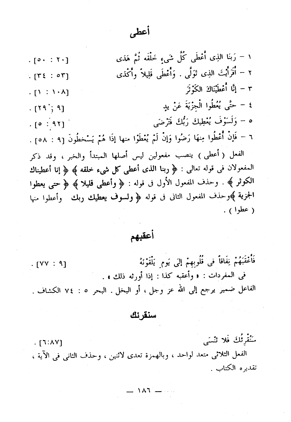 الفعل (أعطى) ينصب مفعولين ليس أصلها المبتدأ والخبر، وقد ذكر المفعولان في قوله تعالى: {ربنا الذي أعطى كل شيء خلقه} {إنا أعطيناك الكوثر}. وحذف المفعول الأول في قوله: {وأعطى قليلا} {حتى يعطوا الجزية} وحذف المفعول الثاني في قوله {ولسوف يعطيك ربك} وأعطوا منها (عطوا).