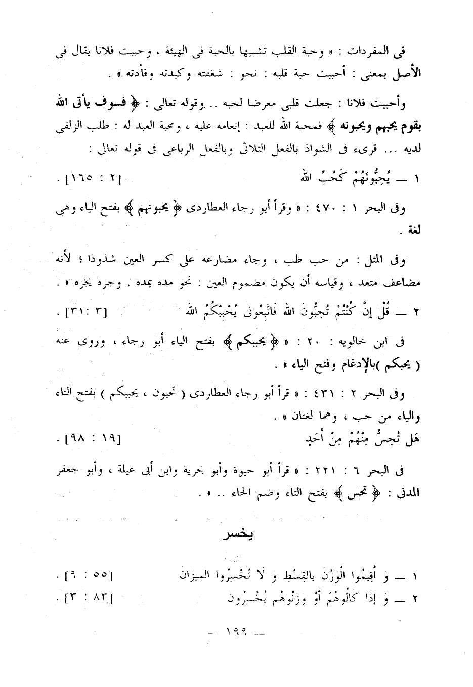 وفي البحر 1: 470: «وقرأ أبو رجاء العطاردي {يحبونهم} بفتح الياء وهي لغة.