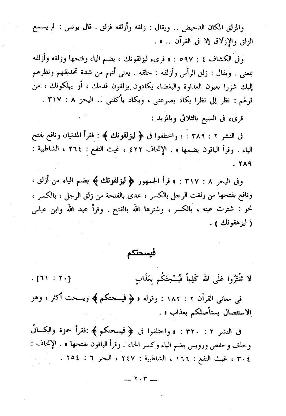 في النشر 2: 320: «واختلفوا في {فيسحتكم}: فقرأ حمزة والكسائي خلف وحفص ورويس بضم الياء وكسر الحاء. وقرأ الباقون بفتحها». الإتحاف: 304، غيث النفع: 166، الشاطبية: 247، البحر 6: 254.