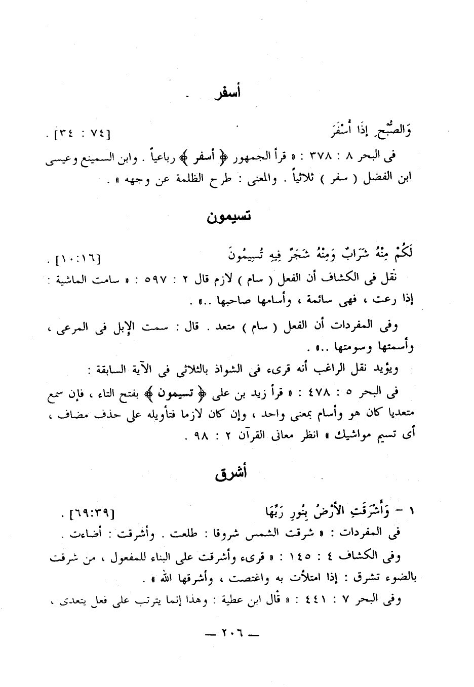 في البحر 8: 378: «قرأ الجمهور {أسفر} رباعيًا. وابن السمينع وعيسى بن الفضل (سفر) ثلاثيا. والمعنى: طرح الظلمة عن وجهه».