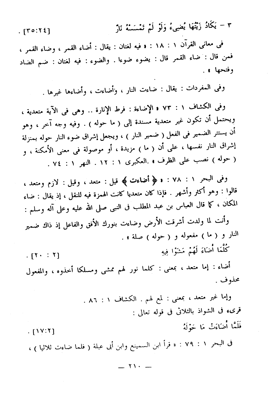 وفي البحر 1: 78: «{أضاءت} قيل: متعد، وقيل: لازم ومتعد، قالوا: وهو أكثر وأشهر. فإذا كان متعديا كانت الهمزة فيه للنقل، إذ يقال: ضاء المكان، كما قال العباس بن عبد المطلب في النبي صلى الله عليه وعلى آله وسلم: