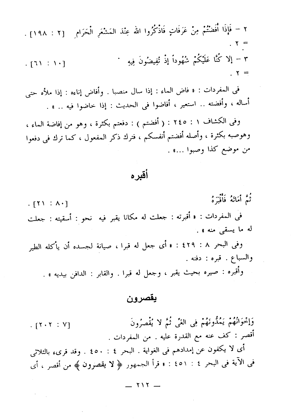 وفي الكشاف 1: 245: «(أفضتم): دفعتم بكثرة، وهو من إفاضة الماء، وهو صبه بكثرة، وأصله أفضتم أنفسكم، فترك ذكر المفعول، كما ترك في دفعوا من موضع كذا وصبوا ...».