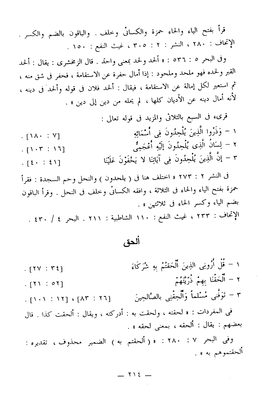 وفي البحر 5: 536: «ألحد ولحد بمعنى واحد. قال الزمخشري: يقال: ألحد القبر ولحده فهو ملحد وملحود: إذا أمال حفرة عن الاستقامة، فحفر في شق منه، ثم استعير لكل إمالة عن الاستقامة، فيقال: ألحد فلان في قوله وألحد في دينه، لأنه أمال دينه عن الأديان كلها، لم يحله من دين إلى دين».