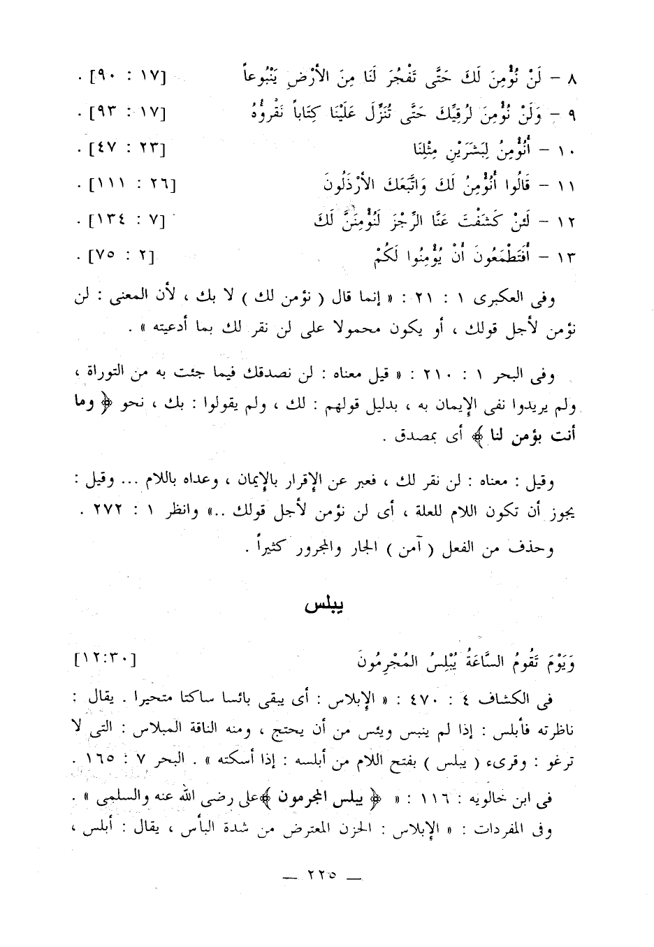 في الكشاف 4: 470: «الإبلاس: أي يبقى بائسا ساكتا متحيرا. يقال: ناظرته فأبلس: إذا لم ينبس ويئس من أن يحتج، ومنه الناقة المبلاس: التي لا ترغو: وقرئ (يبلس) بفتح اللام من أبلسه: إذا أسكته». البحر 7: 165.