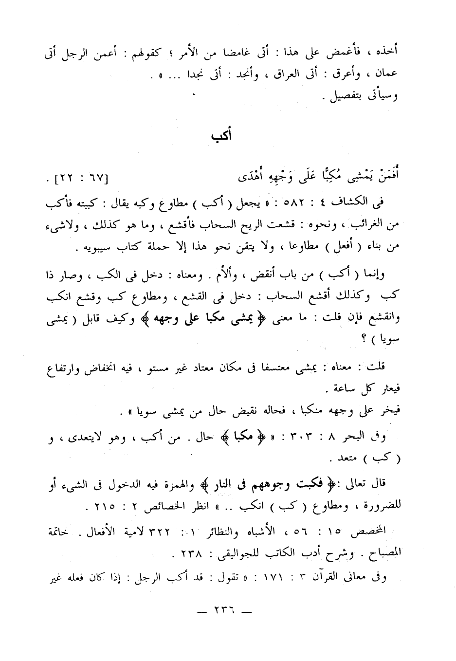 وفي البحر 8: 303: «{مكبا} حال. من أكب، وهو لا يتعدى، وهو (كب) متعد.