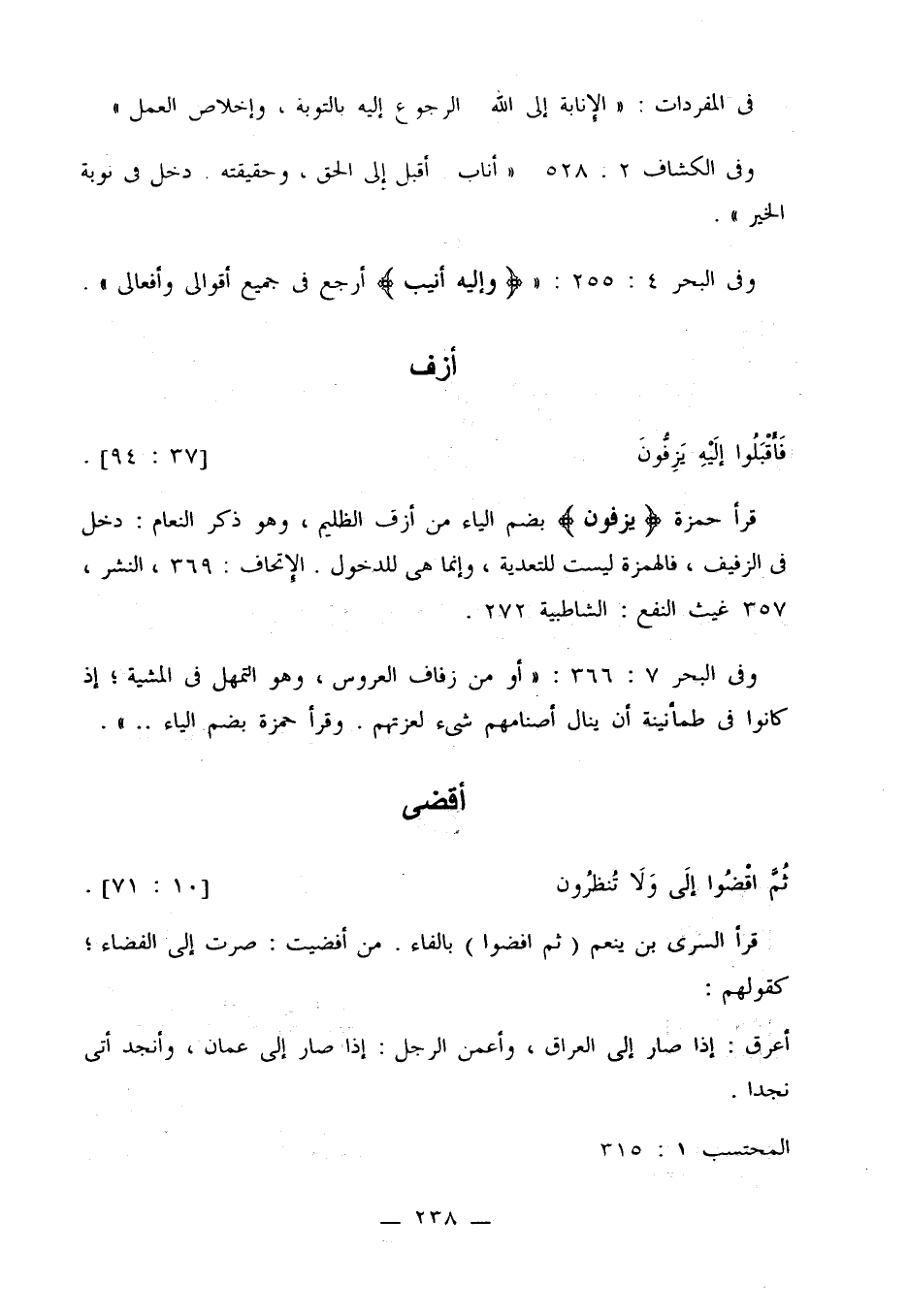 قرأ حمزة {يزفون} بضم الياء من أزف الظليم، وهو ذكر النعام: دخل في الزفيف، فالهمزة ليست للتعدية، وإنما هي للدخول. الإتحاف: 369، النشر، 357 غيث النفع: الشاطبية 272.
