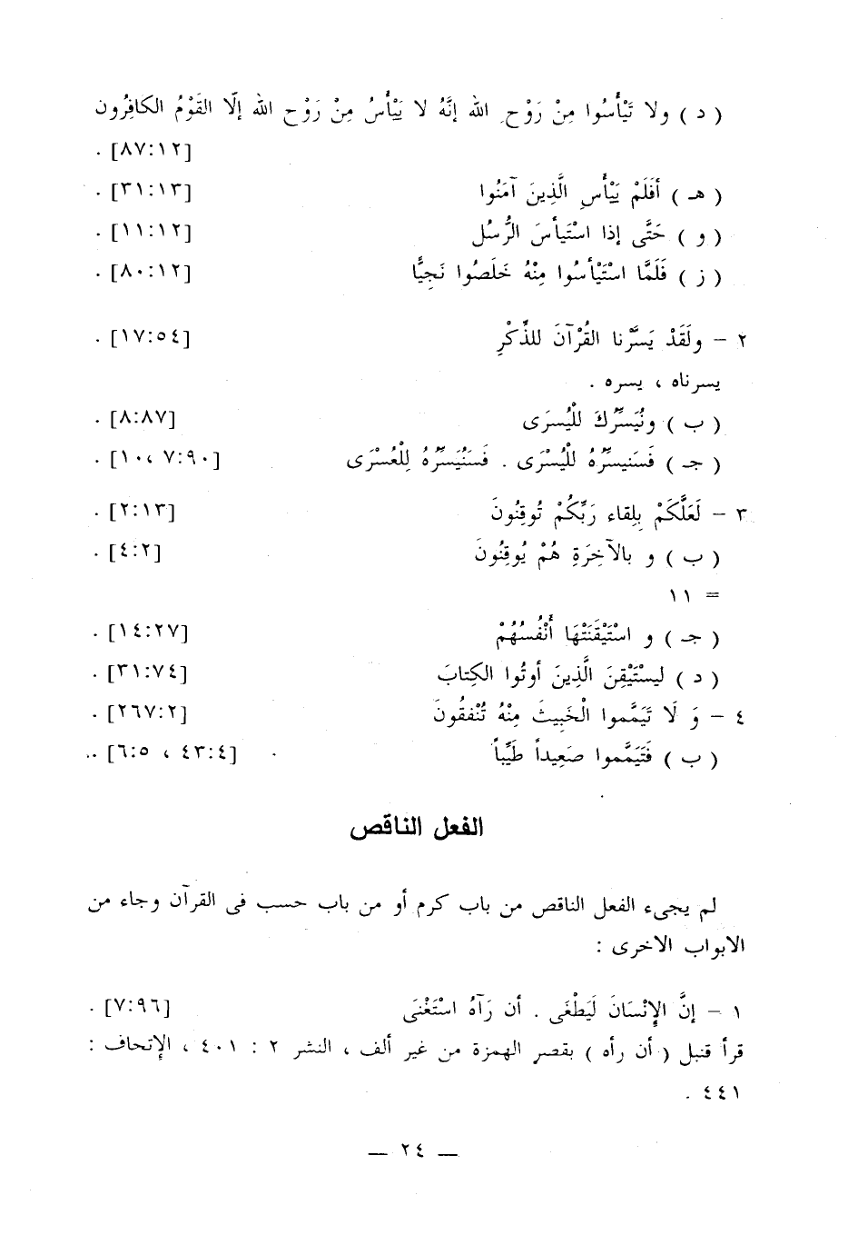 لم يجيء الفعل الناقص من باب كرم أو من باب حسب في القرآن وجاء من الأبواب الأخرى:
