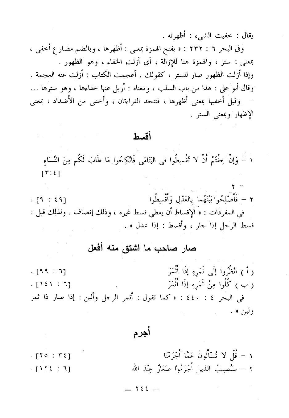 وفي البحر 6: 232: «بفتح الهمزة بمعنى: أظهرها، وبالضم مضارع أخفى، بمعنى: ستر، والهمزة هنا للإزالة، أي أزلت الخفاء، وهو الظهور.