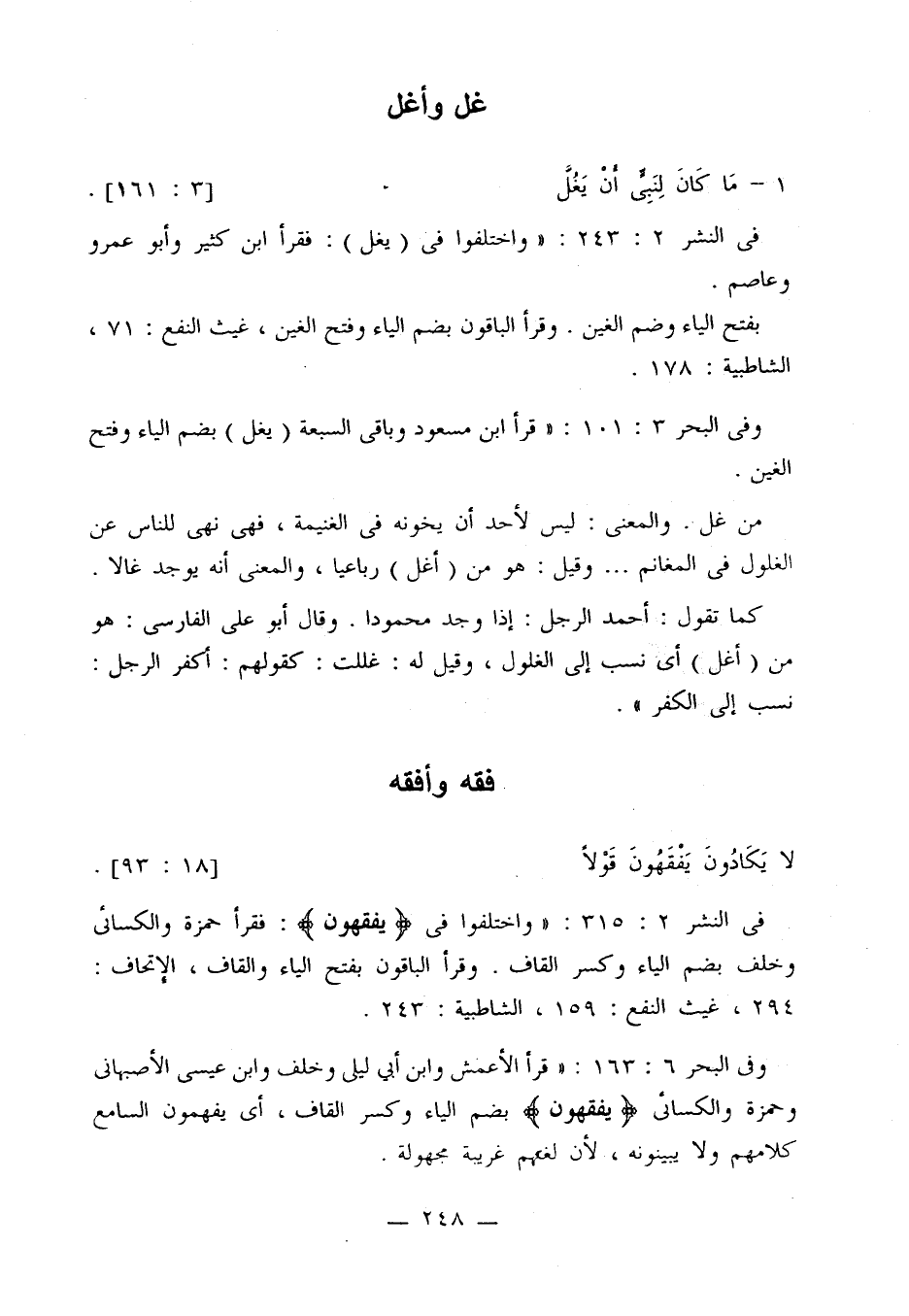 في النشر 2: 243: «واختلفوا في (يغل): فقرأ ابن كثير وأبو عمرو وعاصم.