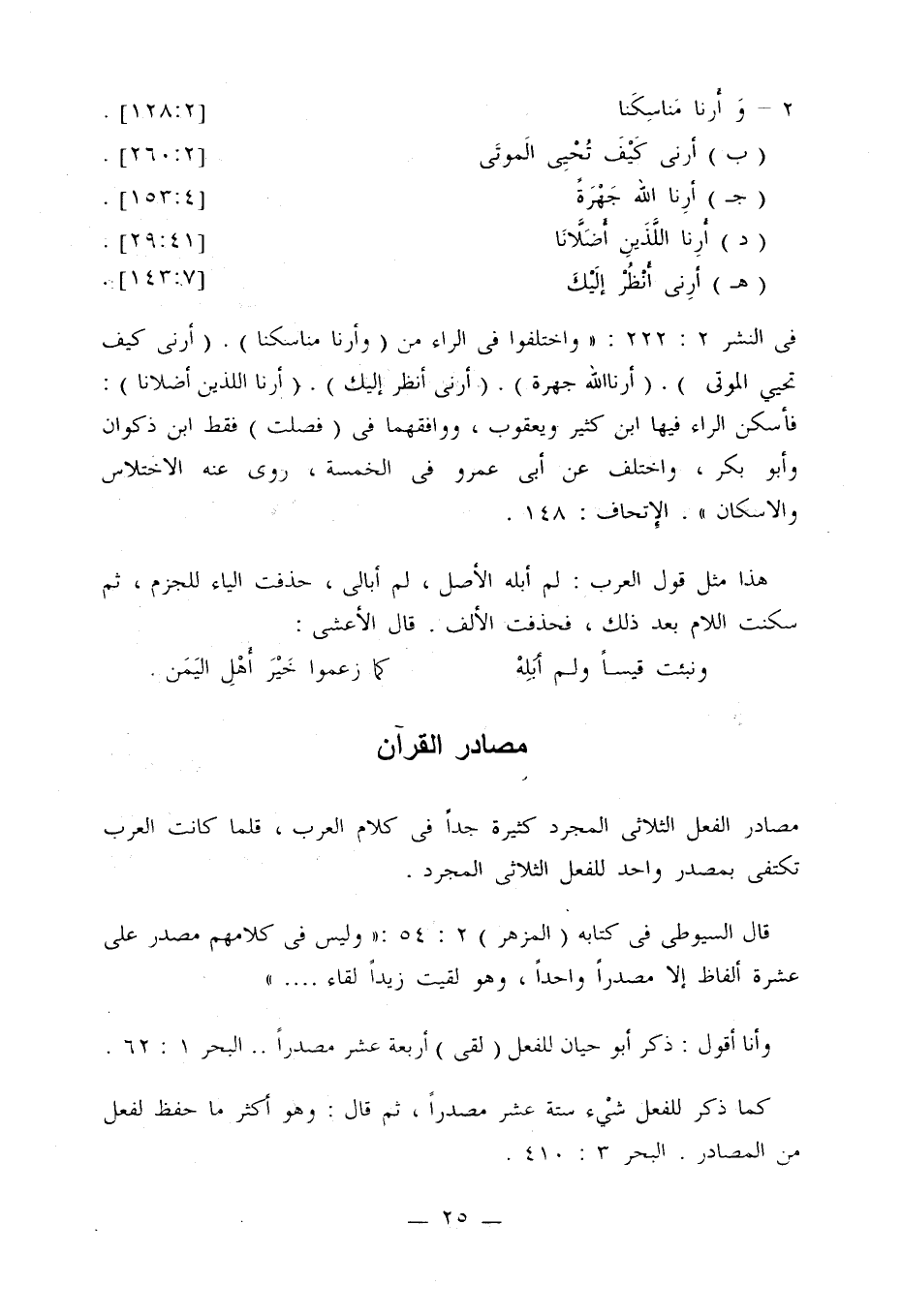 في النشر 2: 222: «واختلفوا في الراء من (وأرنا مناسكنا). (أرني كيف تحيي الموتى). (أرنا الله جهرة). (أرني أنظر إليك). (أرنا اللذين أضلانا): فأسكن الراء فيها ابن كثير ويعقوب، ووافقهما في (فصلت) فقط ابن ذكوان وأبو بكر، واختلف عن أبي عمرو في الخمسة، روى عنه الاختلاس والإسكان». الإتحاف: 148.