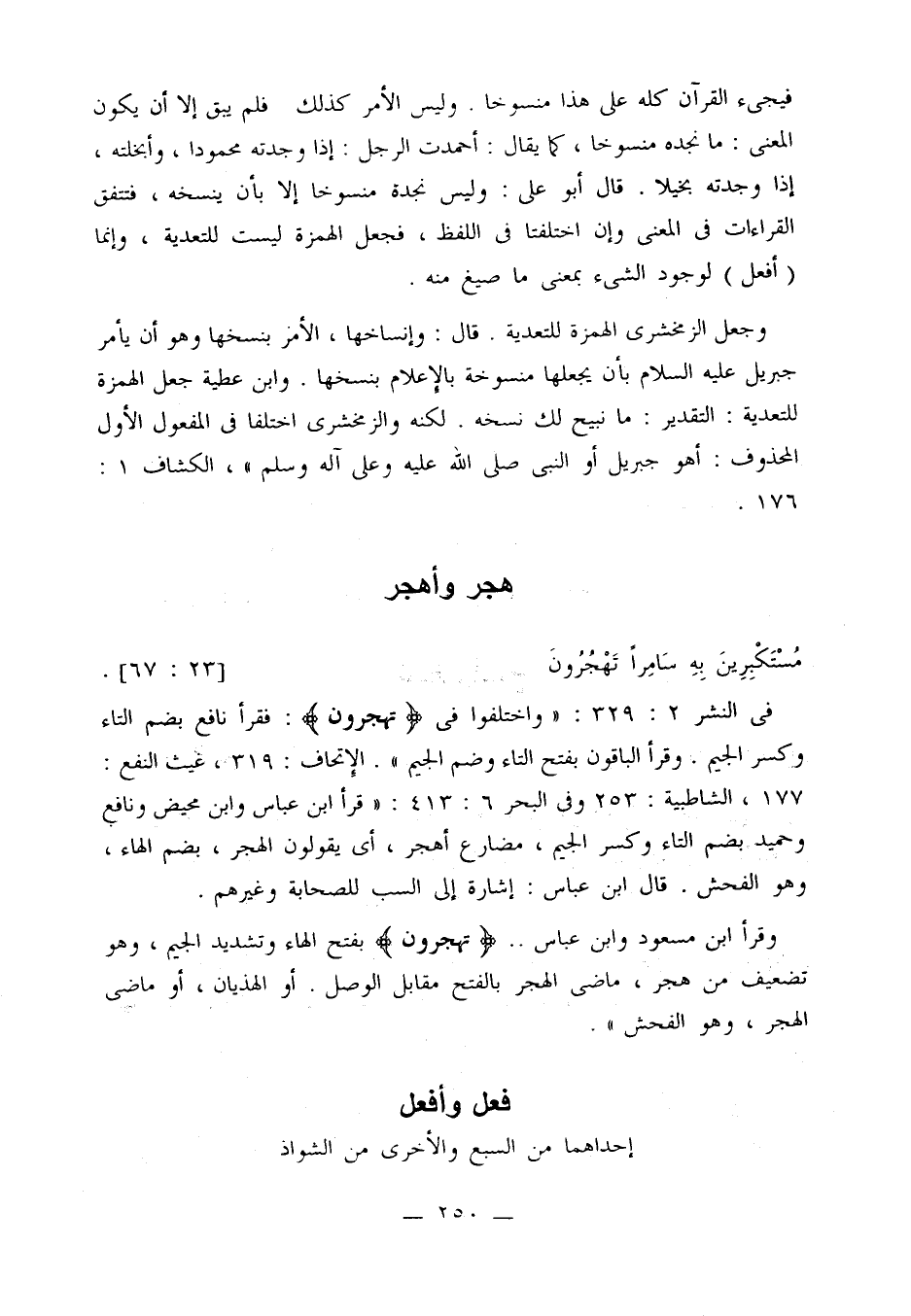 في النشر 2: 329: «واختلفوا في {تهجرون}: فقرأ نافع بضم التاء وكسر الجيم. وقرأ الباقون بفتح التاء وضم الجيم». الإتحاف: 319، غيث النفع: 177، الشاطبية: 253، وفي البحر 6: 413: «قرأ ابن عباس وابن محيض ونافع وحميد بضم التاء وكسر الجيم، مضارع أهجر، أي يقولون الهجر، بضم الهاء، وهو الفحش. قال ابن عباس: إشارة إلى السب للصحابة وغيرهم.