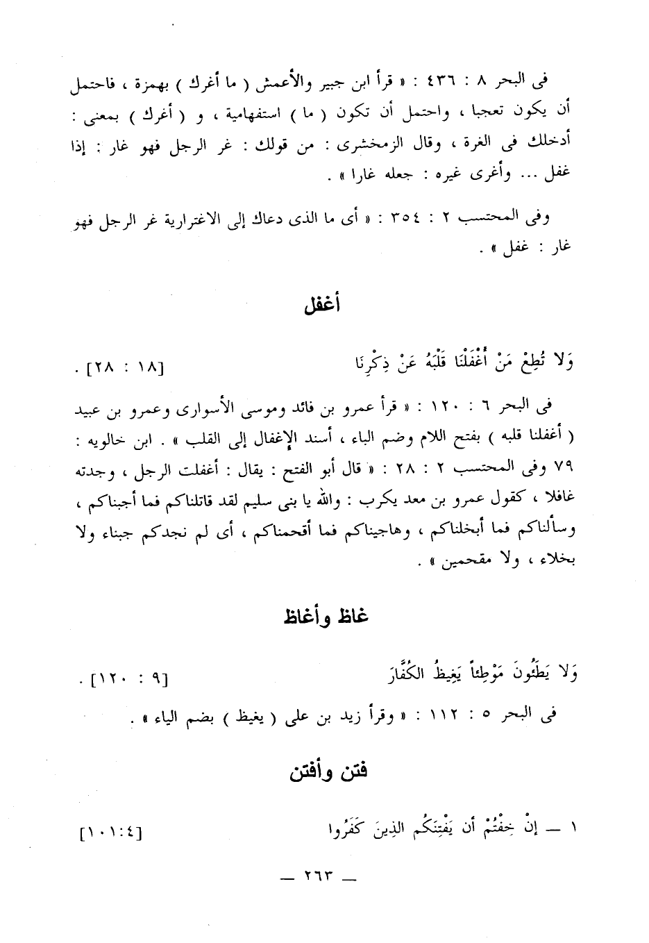 في البحر 6: 120: «قرأ عمرو بن فائد وموسى الأسواري وعمرو بن عبيد (أغفلنا قلبه) بفتح اللام وضم الباء، أسند الإغفال إلى القلب». ابن خالويه: 79 وفي المحتسب 2: 28: «قال أبو الفتح: يقال: أغفلت الرجل، وجدته غافلا، كقول عمرو بن معد يكرب: والله يا بني سليم لقد قاتلناكم فما أجبناكم، وسألناكم فما أبخلناكم، وهاجيناكم فما أقحمناكم، أي لم نجدكم جبناء ولا بخلاء، ولا مقحمين».
