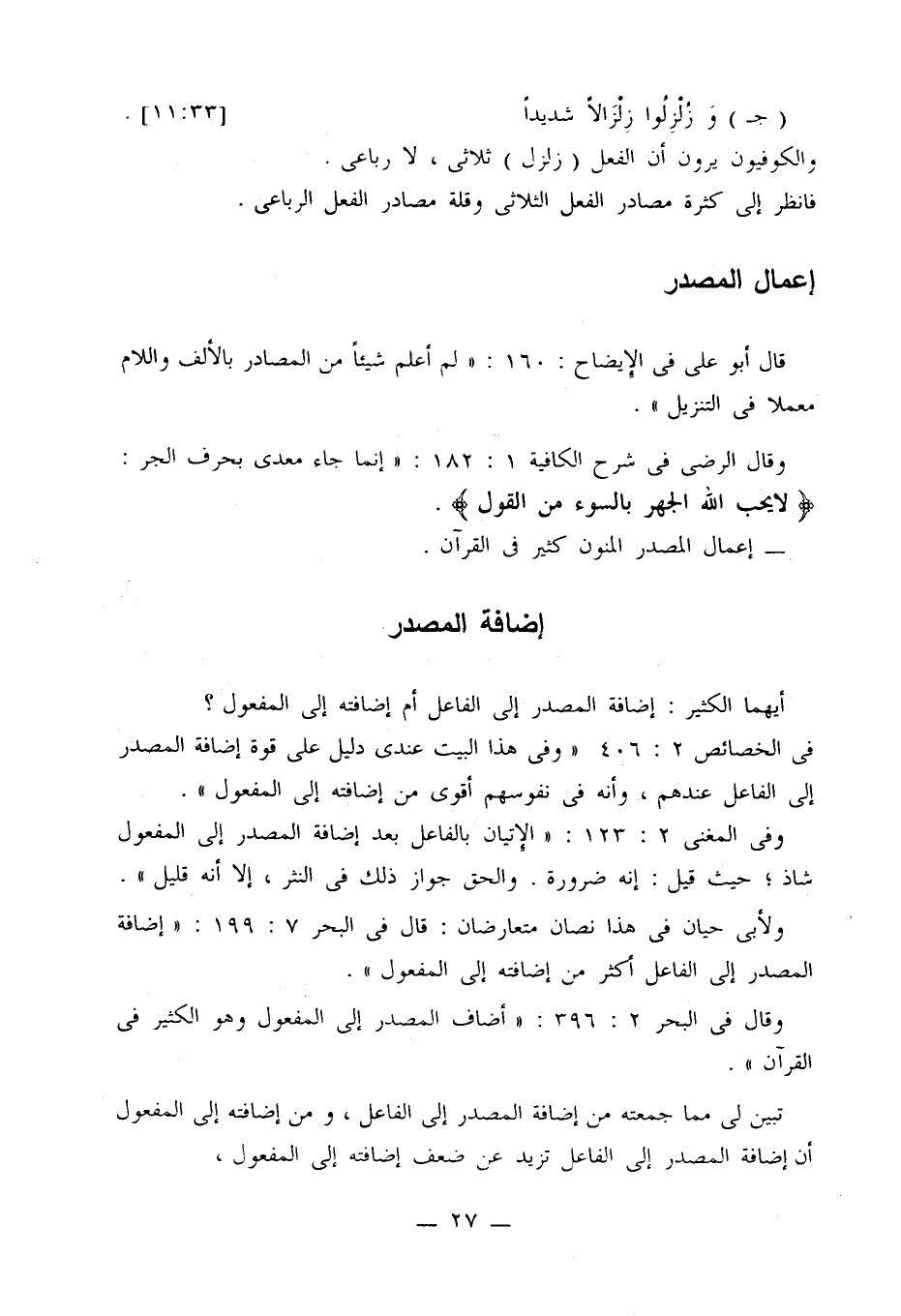 قال أبو علي في الإيضاح: 160: «لم أعلم شيئًا من المصادر بالألف واللام معملا في التنزيل».