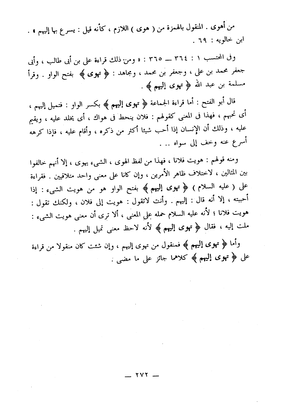 وفي المحتسب 1: 364 - 365: «ومن ذلك قراءة علي بن أبي طالب، وأبي جعفر محمد ابن علي، وجعفر بن محمد، ومجاهد: {تهوى} بفتح الواو. وقرأ مسلمة بن عبد الله {تهوى إليهم}.