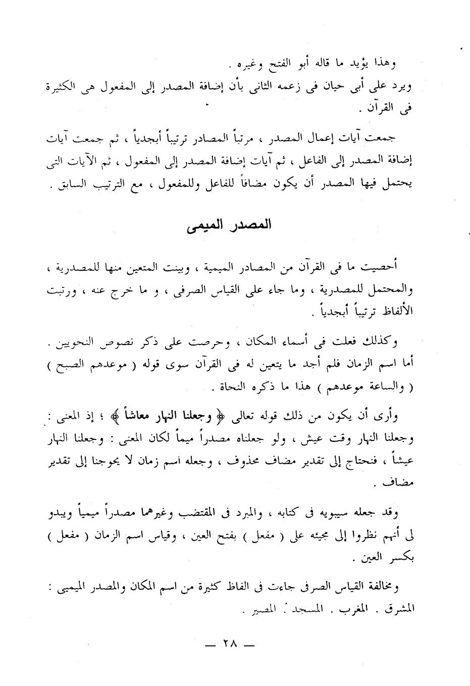 أحصيت ما في القرآن من مصادر الميمية، وبينت المتعين منها للمصدرية، والمحتمل للمصدرية، وما جاء على القياس الصرفي، وما خرج عنه، ورتبت الألفاظ ترتيبًا أبجديًا.