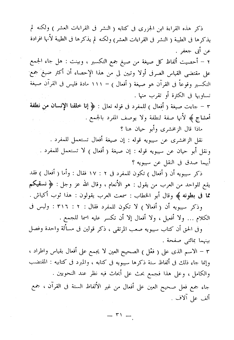 3 - جاءت صيغة (أفعال) للمفرد في قوله تعالى: {إنا خلقنا الإنسان من نطفة أمشاج} لأنها صفة لنطفة ولا يوصف المفرد بالجمع.