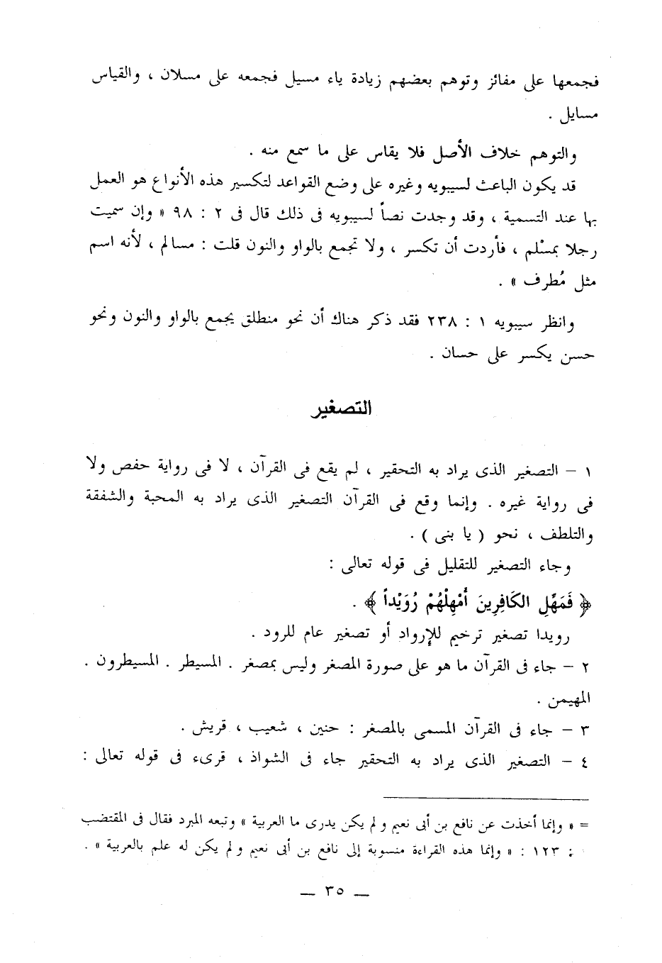 4 - التصغير الذي يراد به التحقير جاء في الشواذ، قرئ في قوله تعالى: