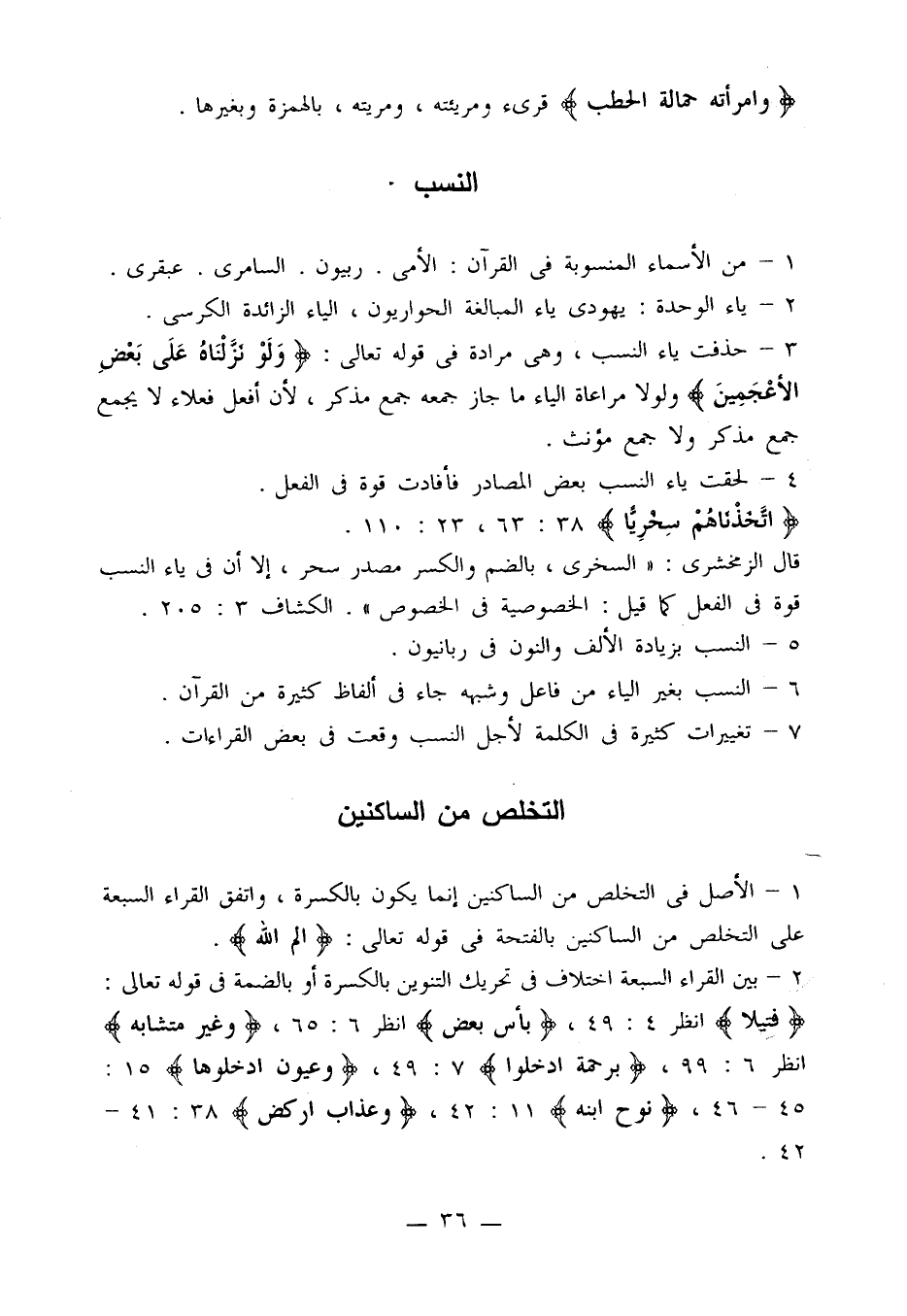 7 - تغييرات كثيرة في الكلمة لأجل النسب وقعت في بعض القراءات.