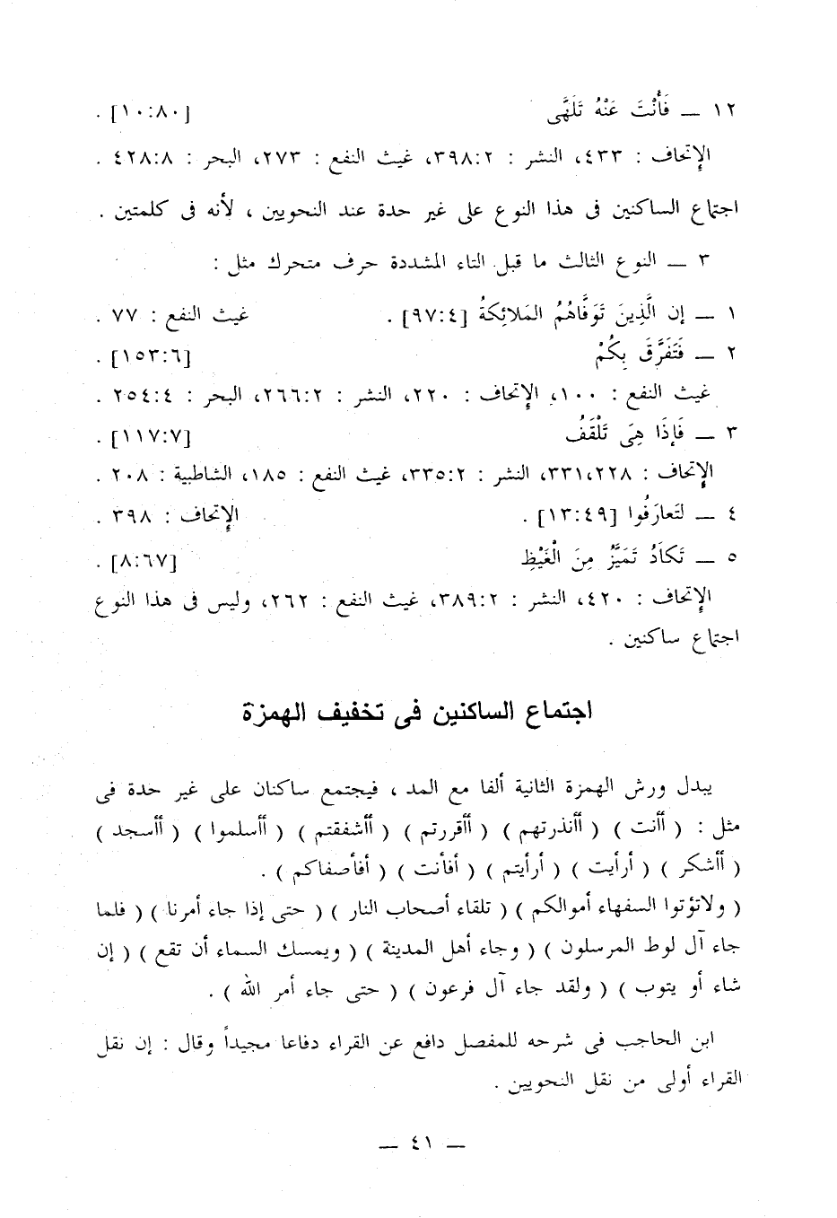 الإتحاف: 420، النشر: 2: 389، غيث النفع: 262، وليس في هذا النوع اجتماع ساكنين.