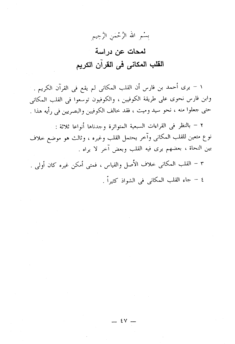 1 - يرى أحمد بن فارس أن القلب المكاني لم يقع في القرآن الكريم. وابن فارس نحوي على طريقة الكوفيين، والكوفيون توسعوا في القلب المكاني حتى جعلوا منه، نحو سيد وميت، فقد خالف الكوفيين والبصريين في رأيه هذا.